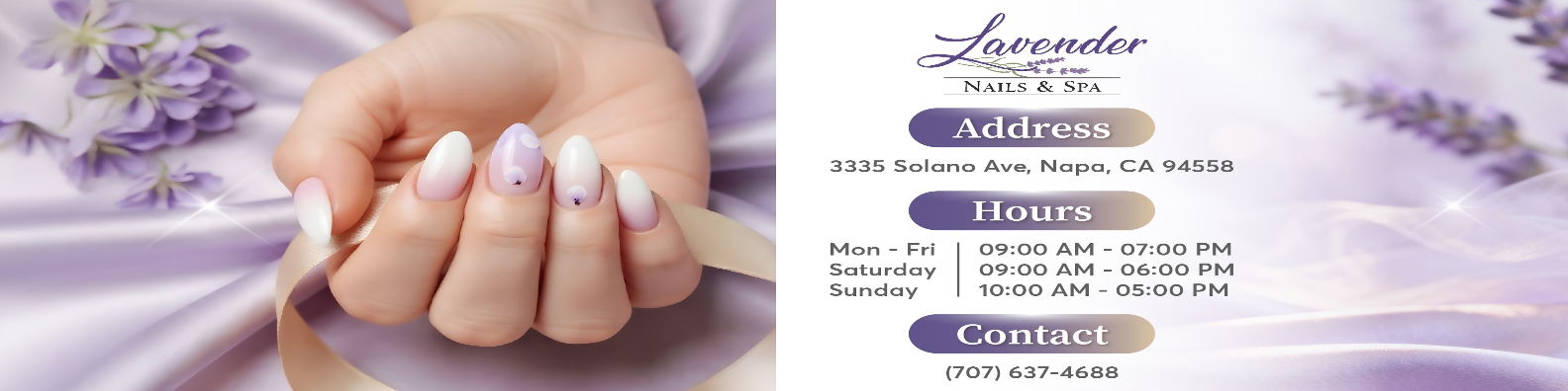 Nail Salon Solano Ave, Napa, CA 94558. Refresh your look at Lavender Nails & Spa LLC — professional manicure & pedicure in a clean, relaxing space.